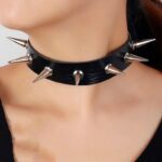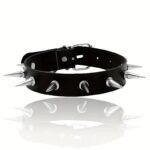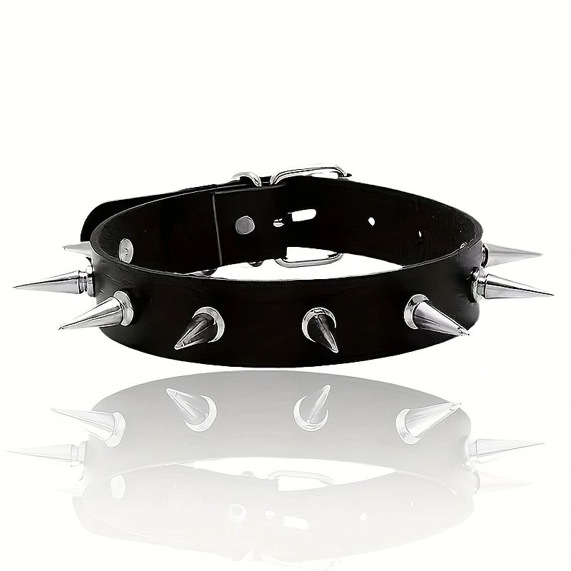 Coleira bondage ajustável por meio de fivelas metálicas, confeccionada em couro sintético.